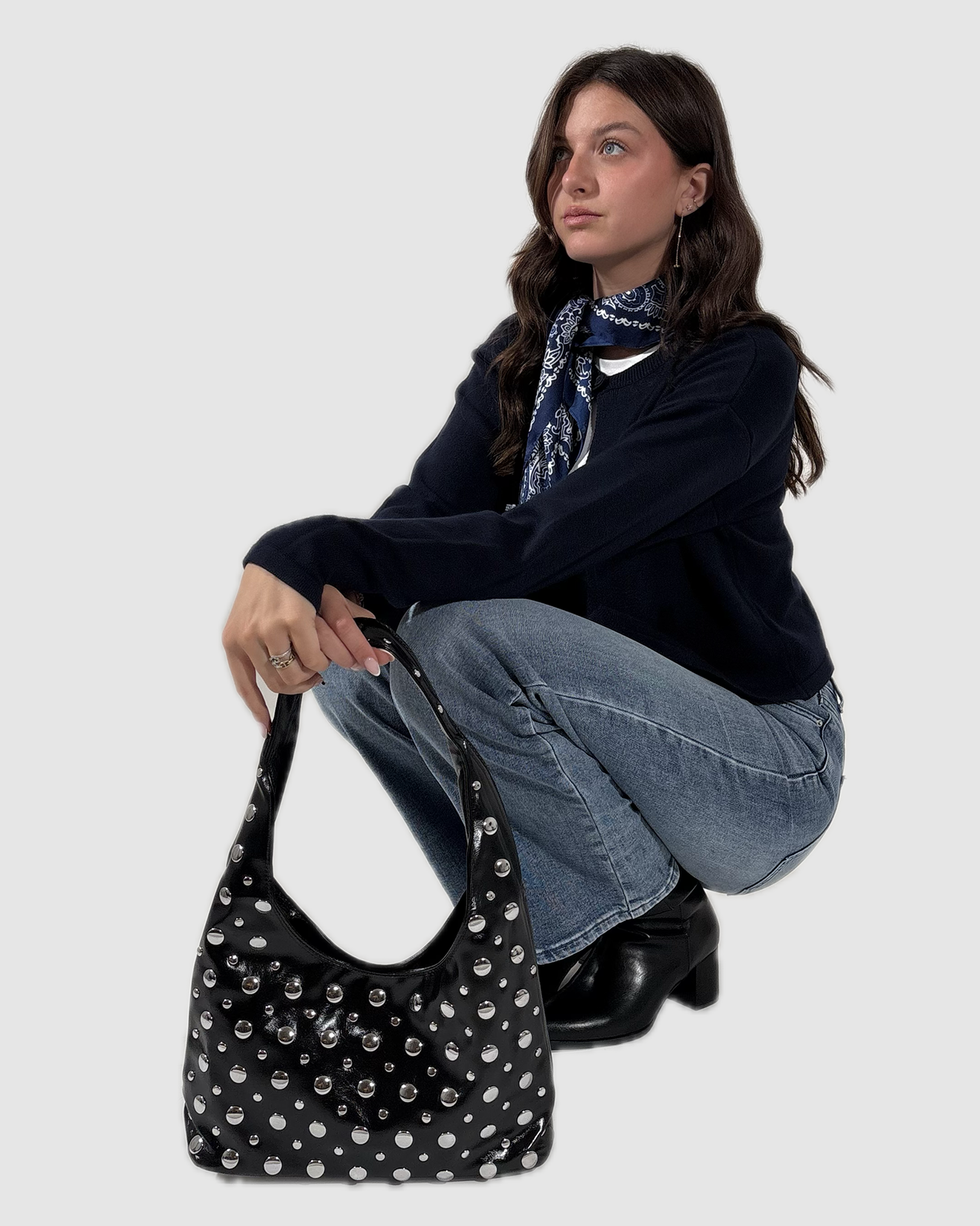 Sac épaule effet vernis, orné de clous métalliques pour un look tendance et affirmé. Son format pratique permet de l’utiliser au quotidien tout en apportant une touche mode et originale à vos tenues.