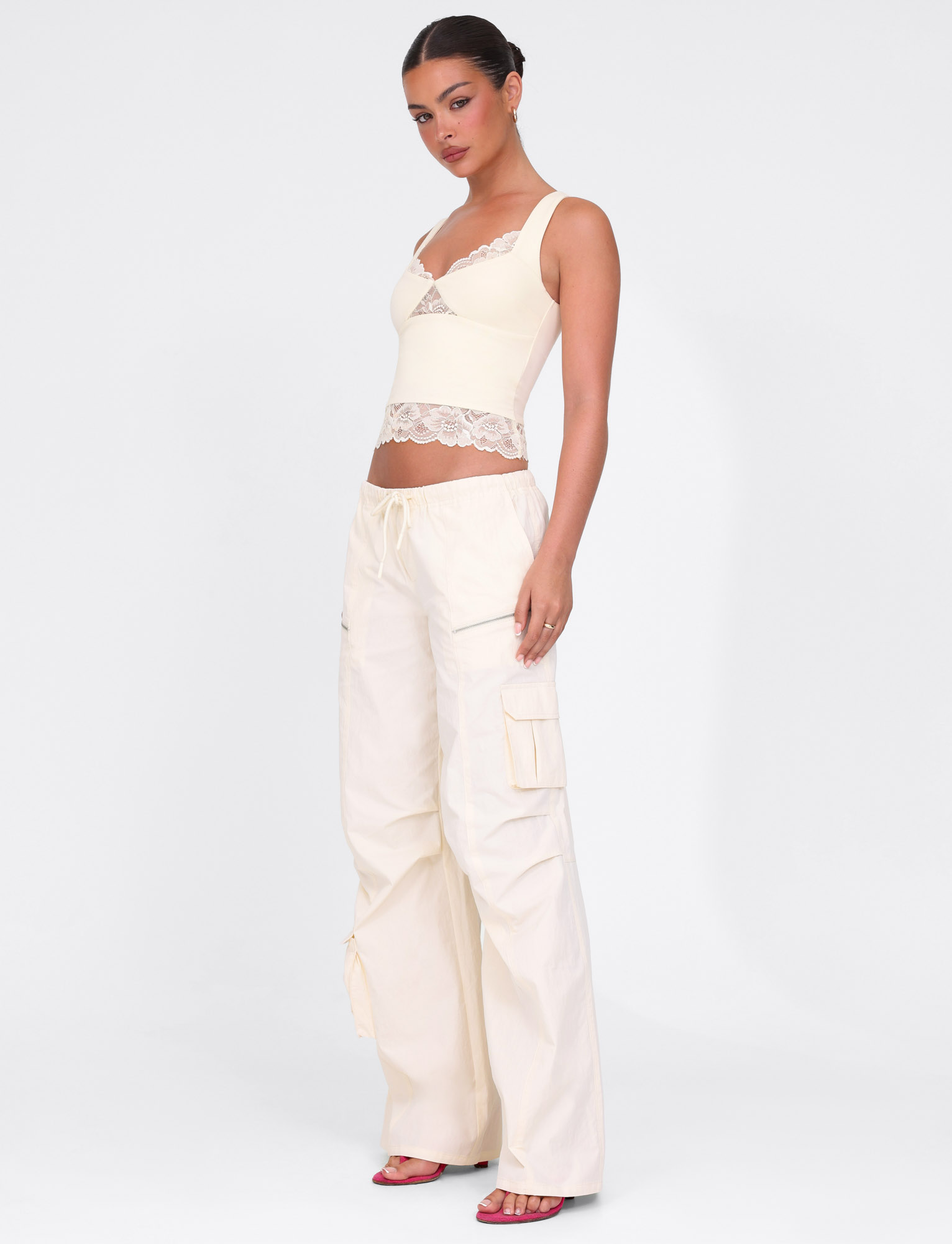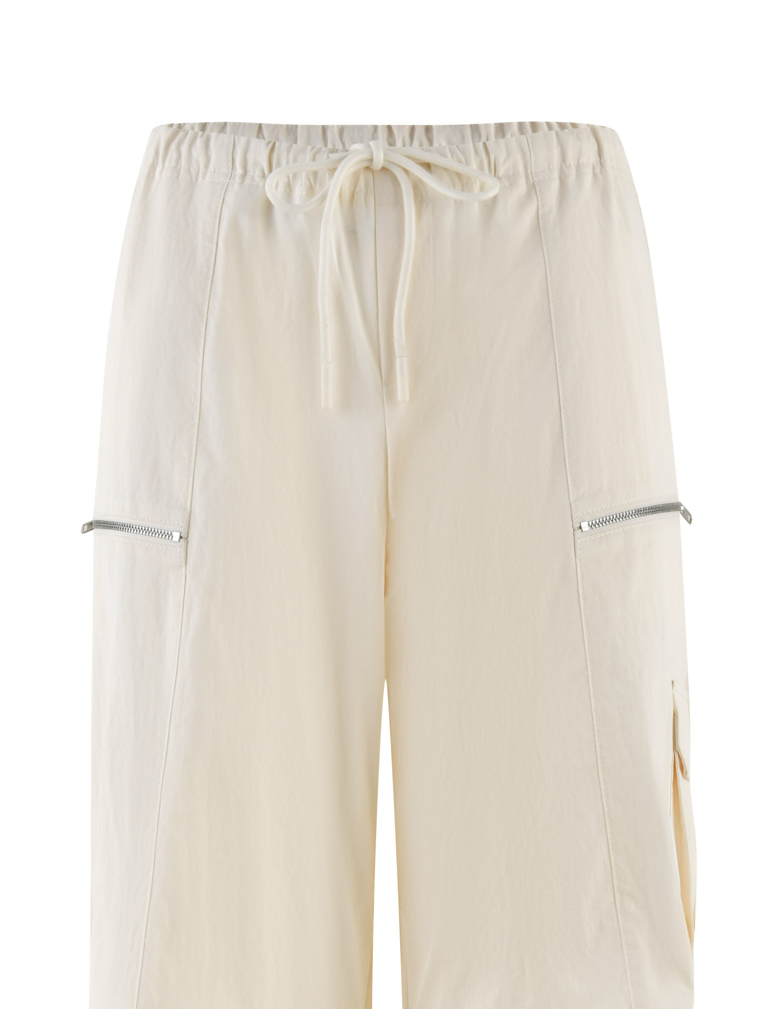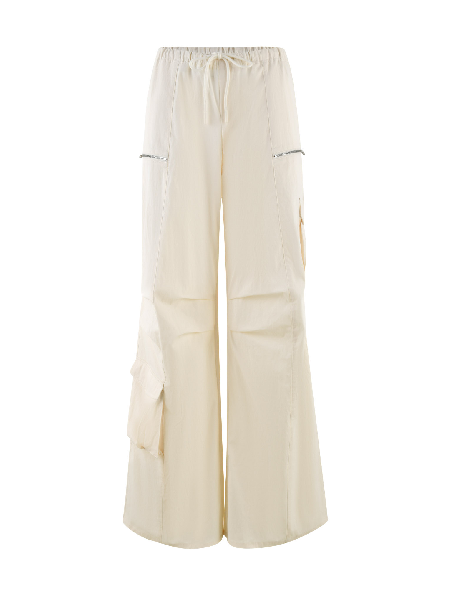 Low rise baggy cargo pants in buttery creamElasticated waist with drawcord Non functional fly Functional side hip pockets Non functional zippers at front thigh