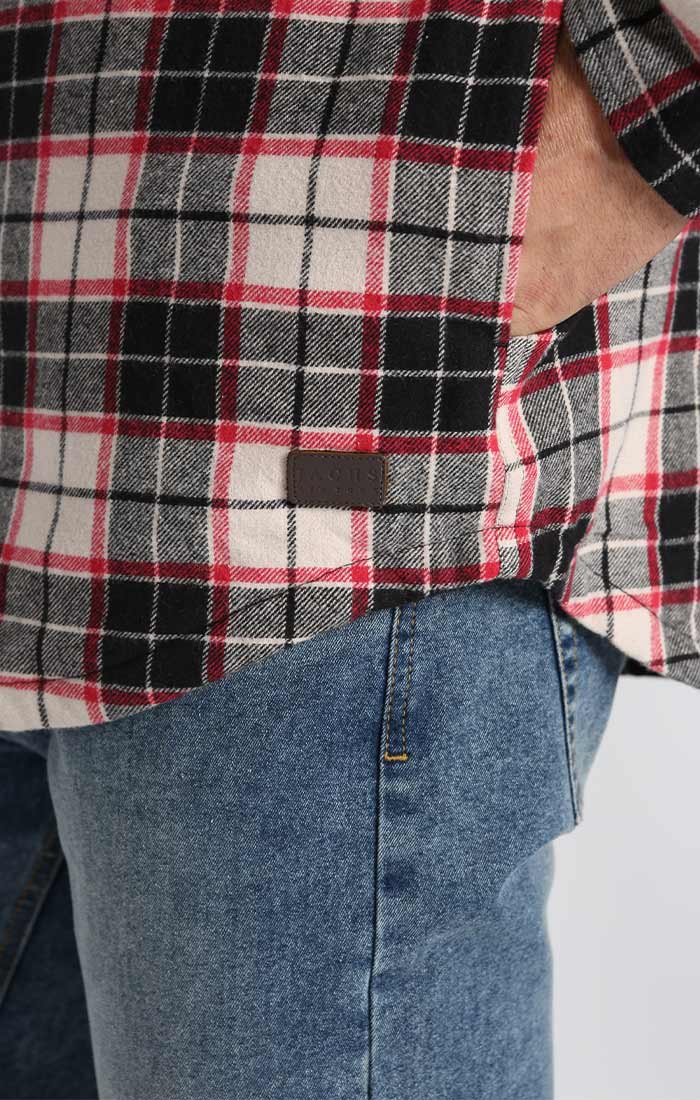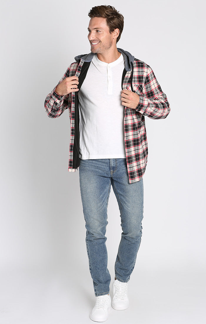 A premium midweight flannel shirt jacket with attached hood and Sherpa Lining.