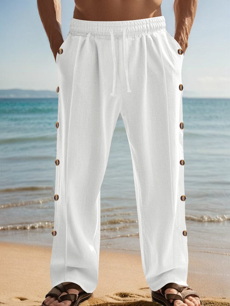 - Pants: Straight legs, elastic waistband with adjustable drawstring, 2 slant pockets, slant button design