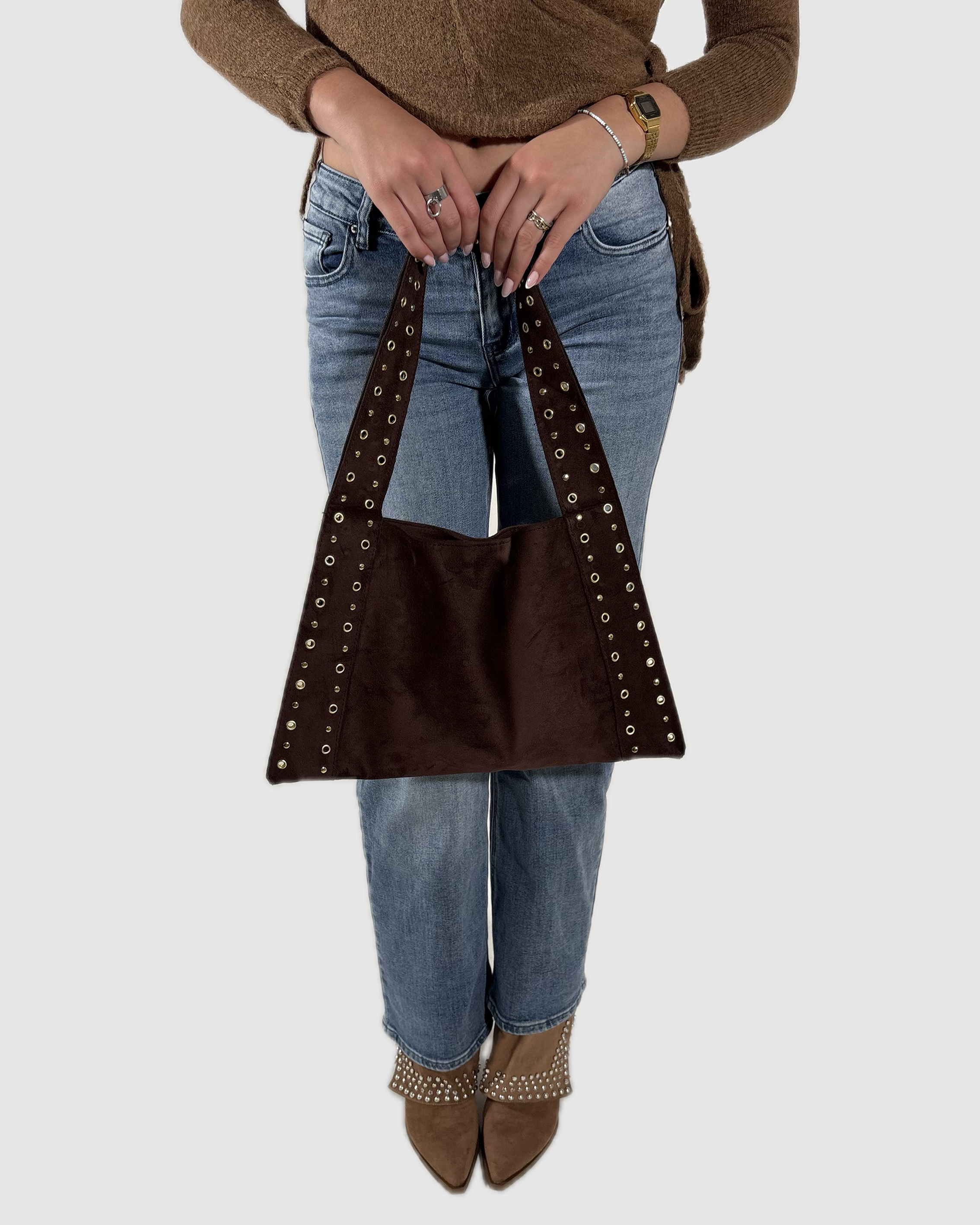 Sac épaule en suédine, décoré de clous métalliques sur l’anse pour une touche tendance et rock. Son format rectangulaire et sa matière effet daim lui donnent un style à la fois moderne et chic, parfait pour accompagner vos tenues de journée comme de soirée.