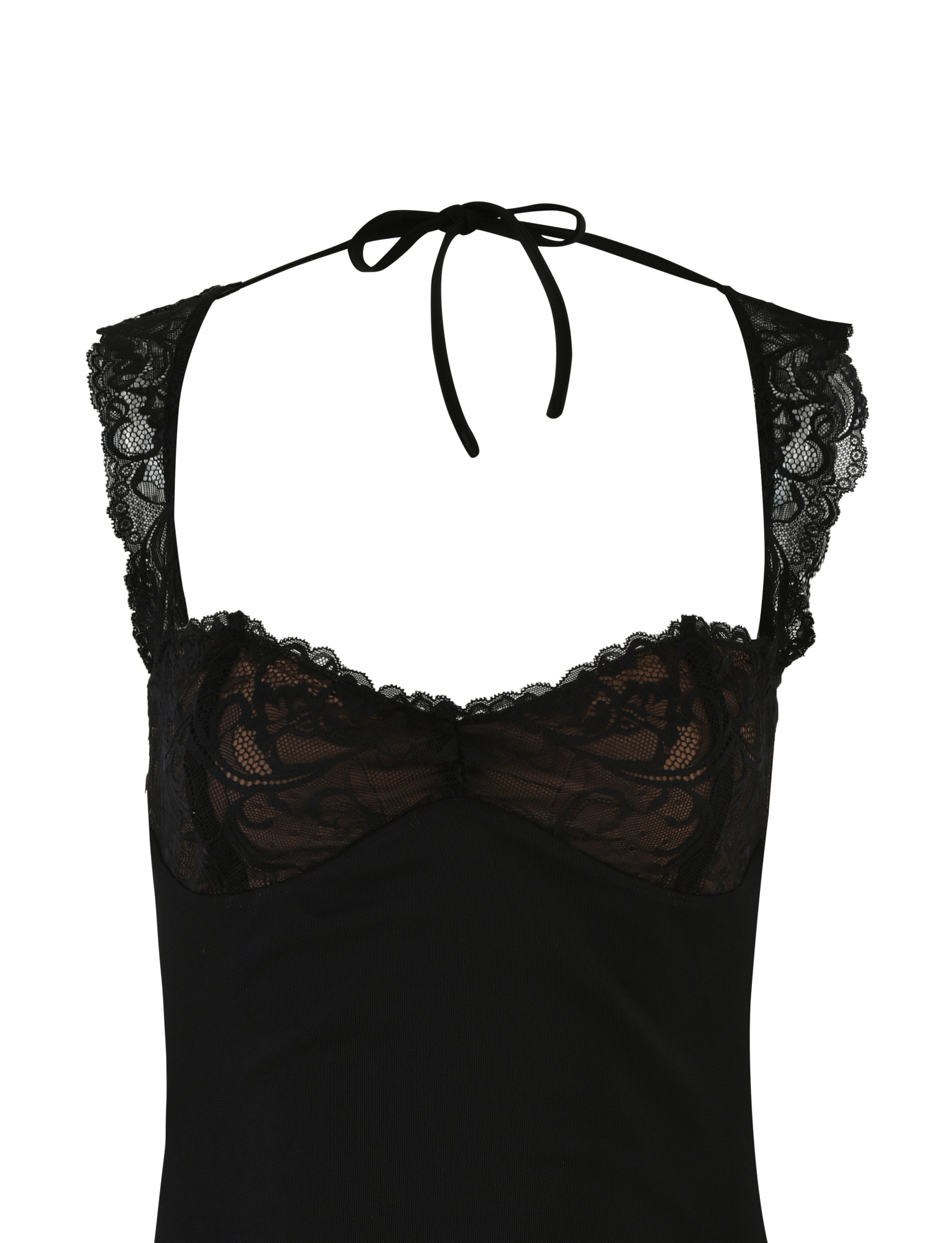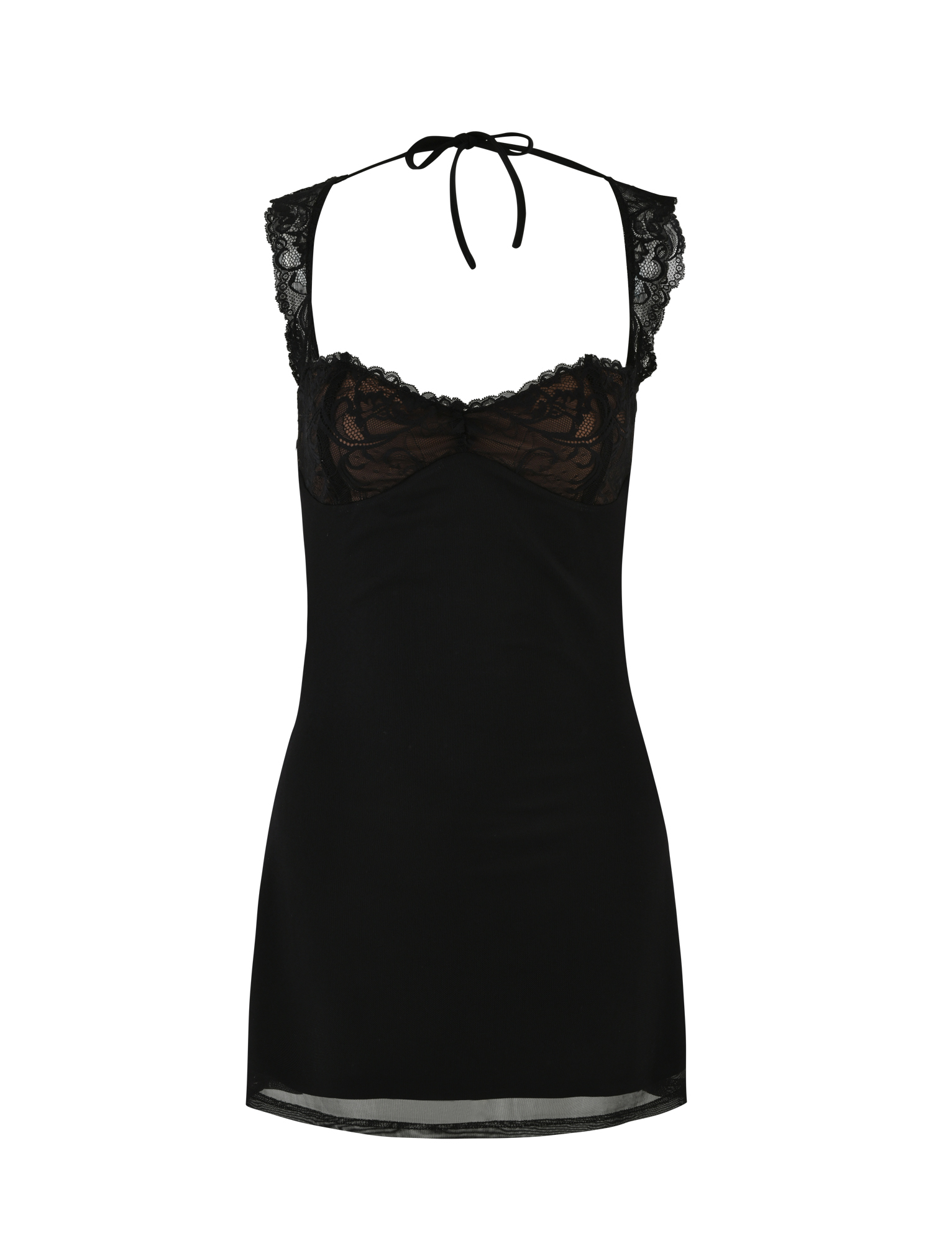Black lace mini dressFixed lace shoulder strapsLace bust panel with gathers at centre frontFeaturing open back designFunctional ties at back neck and back bust