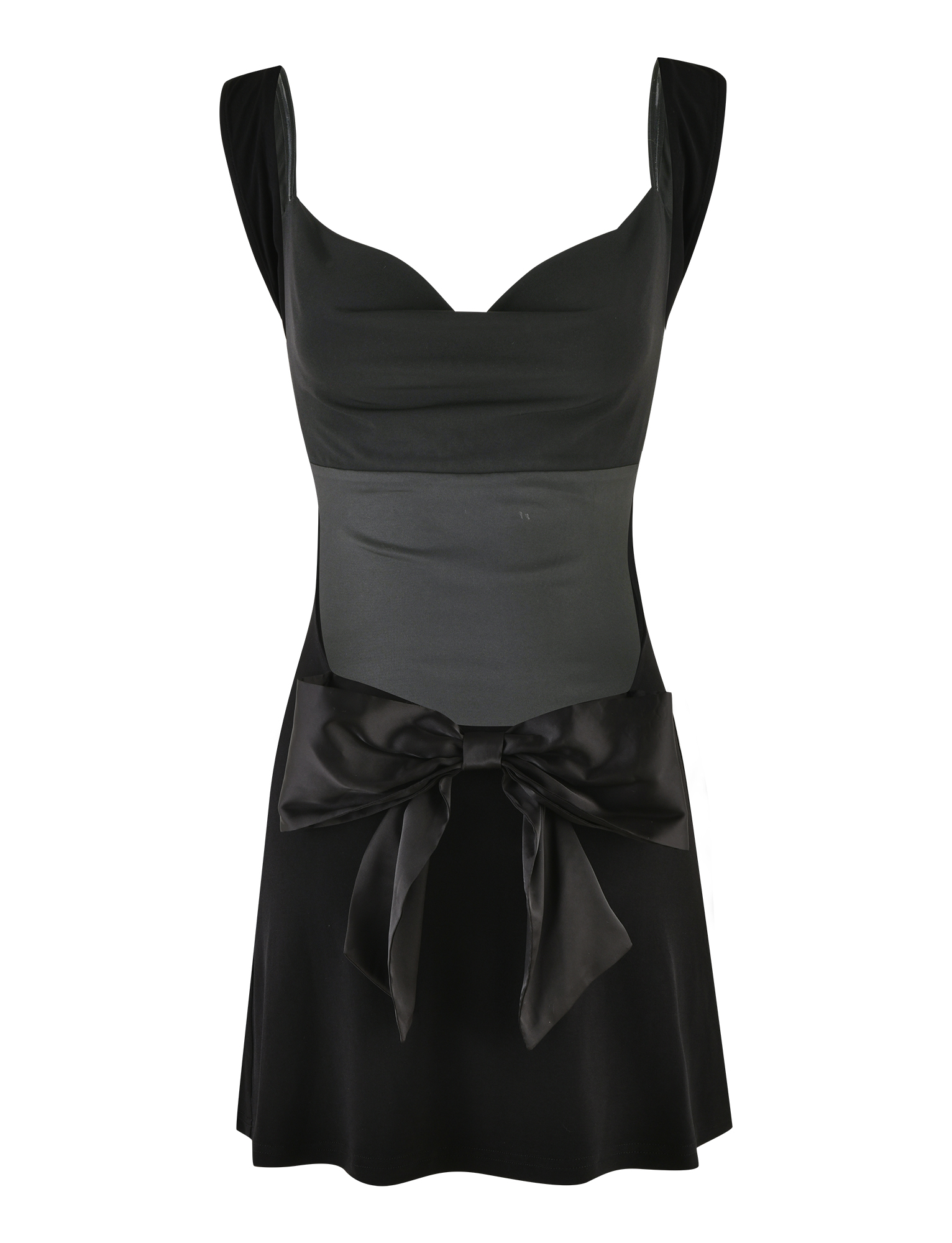 Best selling Zita Dress in new mini styleMini length and A-line silhouette Scoop cowl neckFeaturing low and exposed backBow detail at back hips